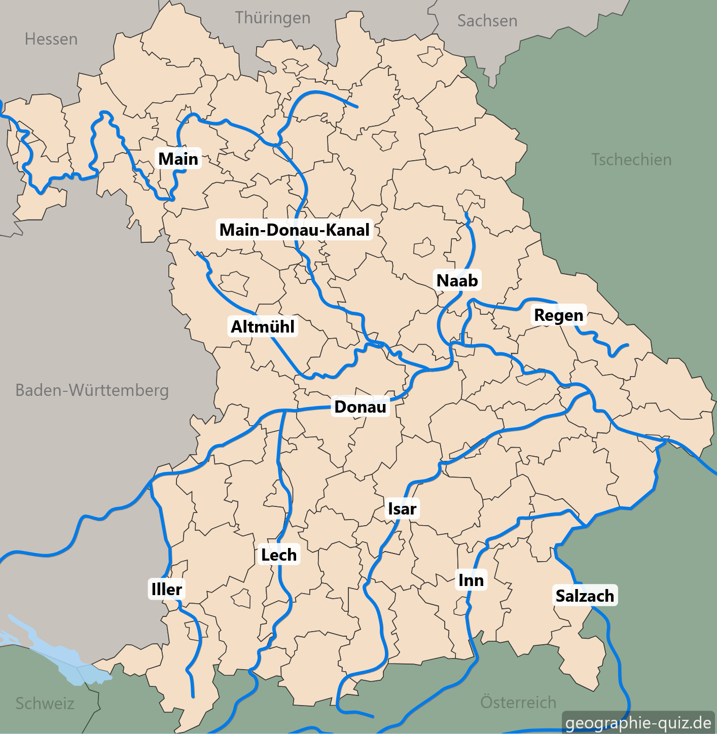 Altmühl, Donau (Danube), Iller, Inn, Isar, Lech, Main, Main-Donau-Kanal (MDK), Naab, Regen und die Salzach